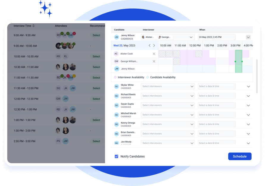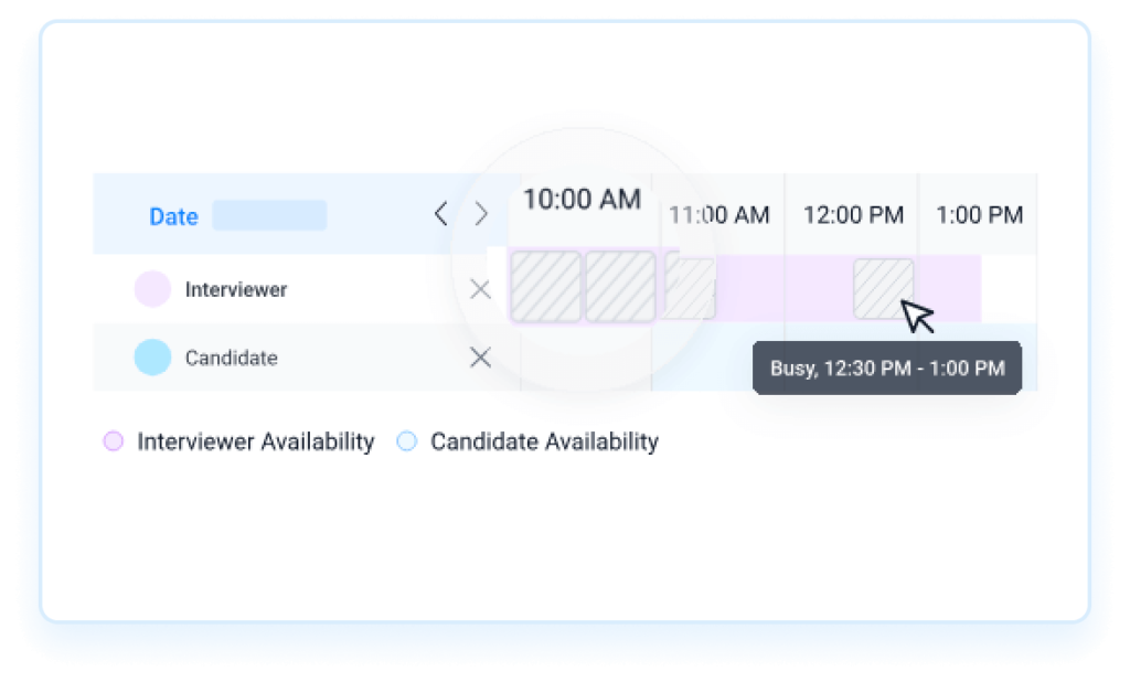 Candidates now have the power to schedule their own interviews effortlessly, aligning with the interviewer’s availability directly from our user-friendly platform. Enhance candidate experience by eliminating manual scheduling and anonymity.
